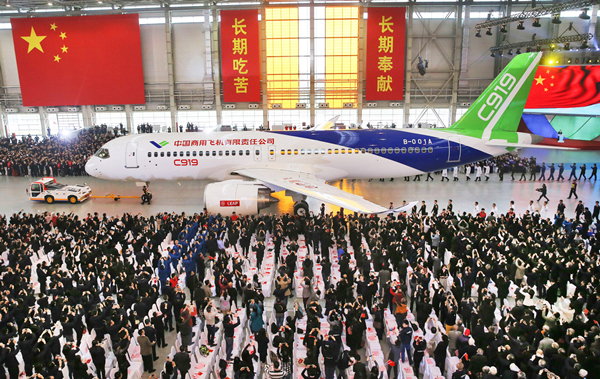 11月2日,我國自主研制的C919大型客機首架機,在中國商飛公司新建成的總裝制造中心浦東基地廠房內正式下線。這標志著C919大型客機項目工程發(fā)展階段研制取得了階段性成果,為下一步首飛奠定了堅實基礎。C919大型客機是建設創(chuàng)新型國家的標志性工程,擁有自主知識產(chǎn)權。針對先進的氣動布局、結構材料和機載系統(tǒng),研制人員共規(guī)劃了102項關鍵技術攻關。(知識產(chǎn)權報/文 新華社/圖)